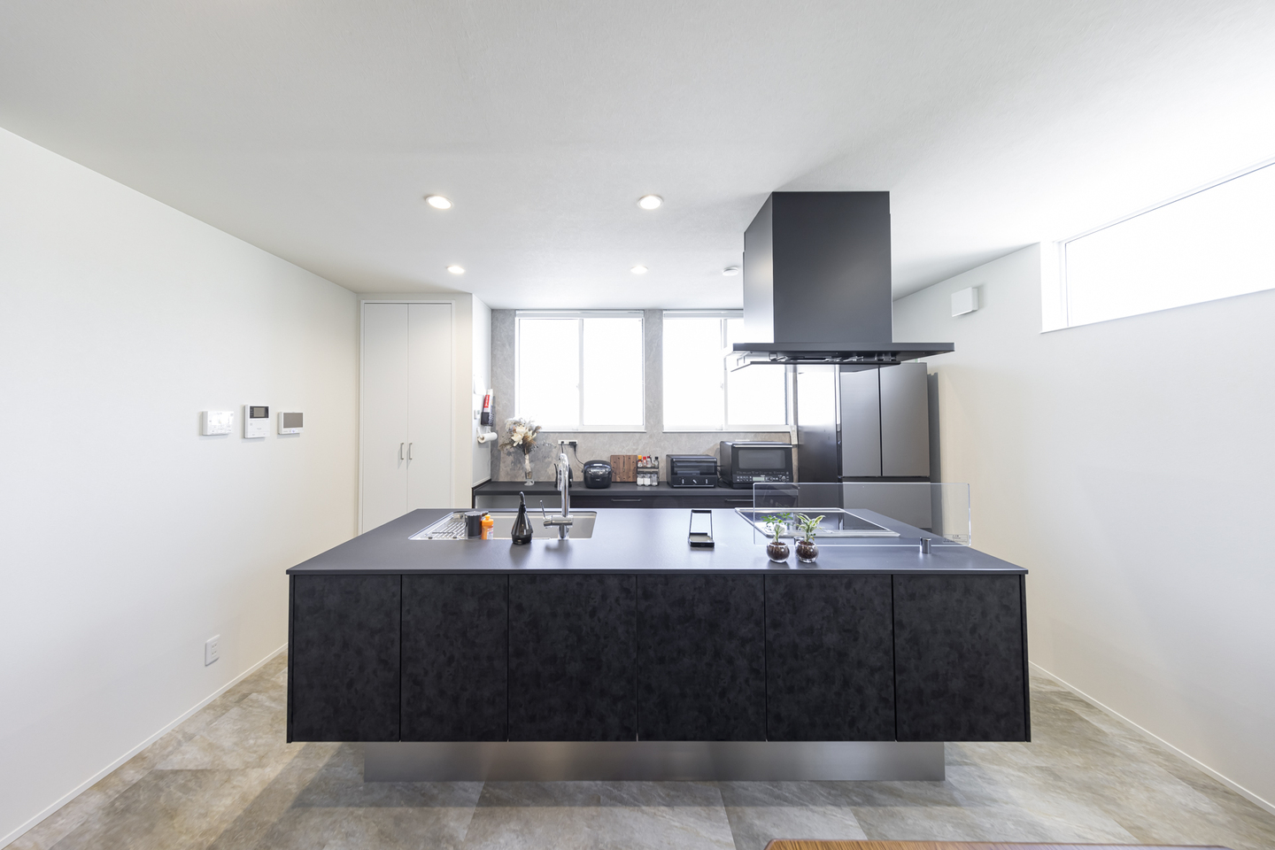 キッチンをカッコよくスタイリッシュにしてもらいたかったです。アイランドキッチンを希望して色や高さも自分たちに合わせてもらいました。あとはリビングを広くしてもらいたくて20畳以上の広さになるように設計してもらいました。